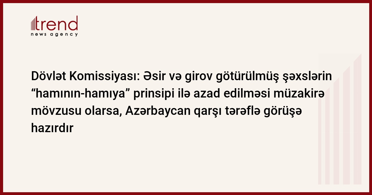 Azərbaycan Respublikasının Əsir və itkin düşmüş, girov götürülmüş vətəndaşlarla əlaqədar Dövlət Komissiyası müzakirəyə çıxarılacaq əsas məsələnin hazırda tərəflərdə saxlanılan şəxslərin qısa müddətdə “hamının-hamıya” prinsipi ilə azad edilməsi mövzusu olacağı təqdirdə, Azərbaycan tərəfinin görüşə hazır olduğunu BİQ həmsədrlərinin diqqətinə çatdırıb.