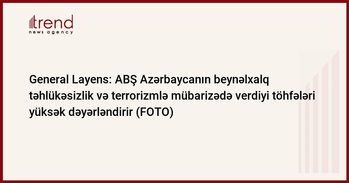 General Layens Azərbaycanın beynəlxalq təhlükəsizlik və terrorizmlə mübarizədə verdiyi töhfələrə, Əfqanıstan və daha geniş coğrafiyada təhlükəsiz və firavan gələcəyi təmin etmək üçün gördüyü vacib işə görə ABŞ-ın Azərbaycanı yüksək dəyərləndirdiyini bir daha qeyd edib.