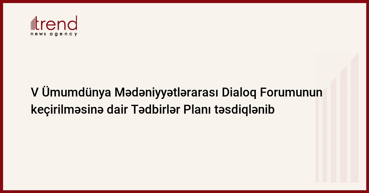 Azərbaycan Prezidenti Administrasiyasının rəhbəri Ramiz Mehdiyevin sərəncamı ilə Bakıda V Ümumdünya Mədəniyyətlərarası Dialoq Forumunun keçirilməsinə dair Tədbirlər Planı təsdiq edilib.