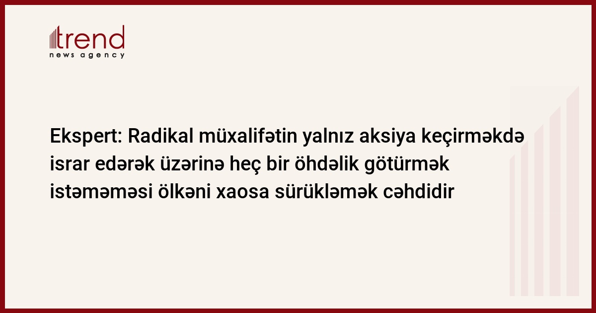 Radikal müxalifətin yalnız aksiya keçirməkdə israr edərək üzərinə heç bir öhdəlik götürmək istəməməsi ölkəni xaosa sürükləmək cəhdidir. Bunu Trend-ə açıqlamasında "Bakı xəbər" qəzetinin baş redaktoru, siyasi ekspert Aydın Quliyev deyib.