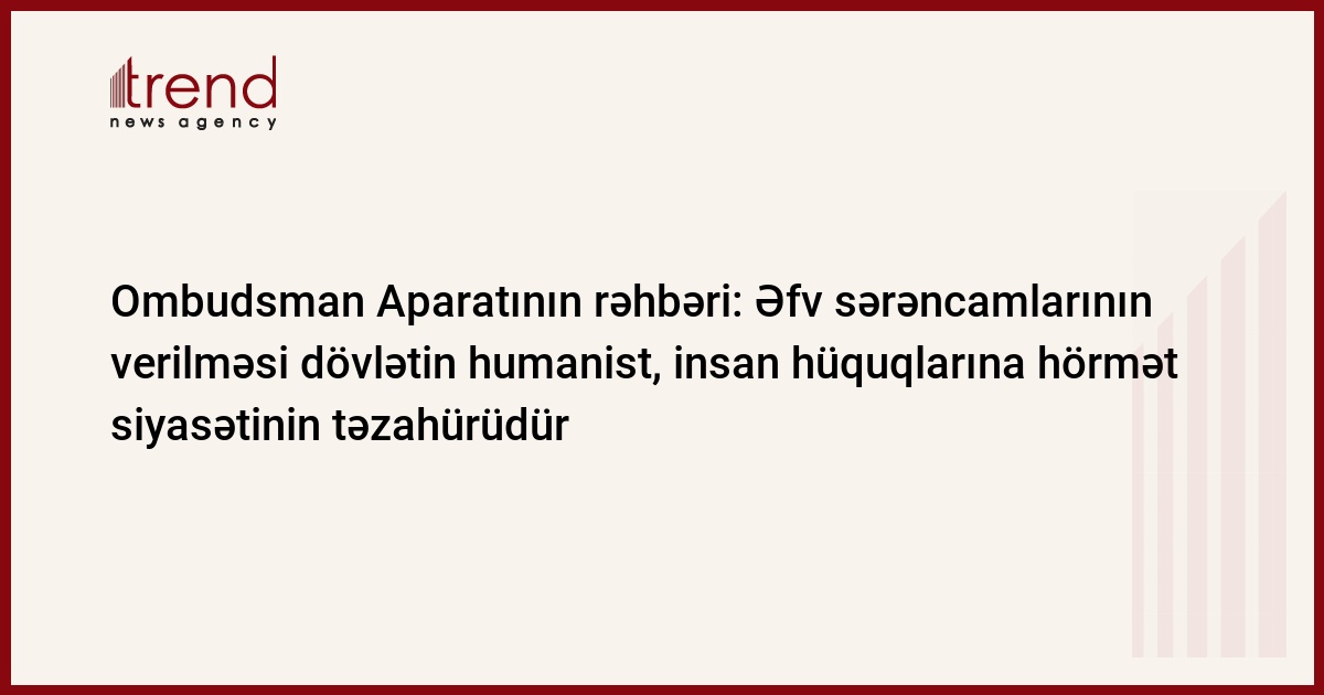"Bu əfv sərəncamında azadlıqdan məhrum etmə və digər cəza növlərinə məhkum edilmiş bir sıra şəxslər cəzanın çəkilməmiş hissəsindən azad edilib, eyni zamanda ömürlük azadlıqdan məhrum edilmiş bir sıra şəxslərin cəzası müddətli azadlıqdan məhrum etmə cəzası ilə əvəz olunub. Qeyd etmək istərdim ki, bu əfv sərəncamında Azərbaycanın insan hüquqları üzrə müvəkkilinin ölkə başçısına ünvanladığı vəsatətlər də nəzərə alınaraq bir qrup məhkum əfv edilib. Müvəkkilin fəaliyyəti dövründə onun vəsatəti ilə ümumilikdə 692, 2019-cu il 16 mart tarixli son sərəncamla isə 54 məhkum əfv edilib".