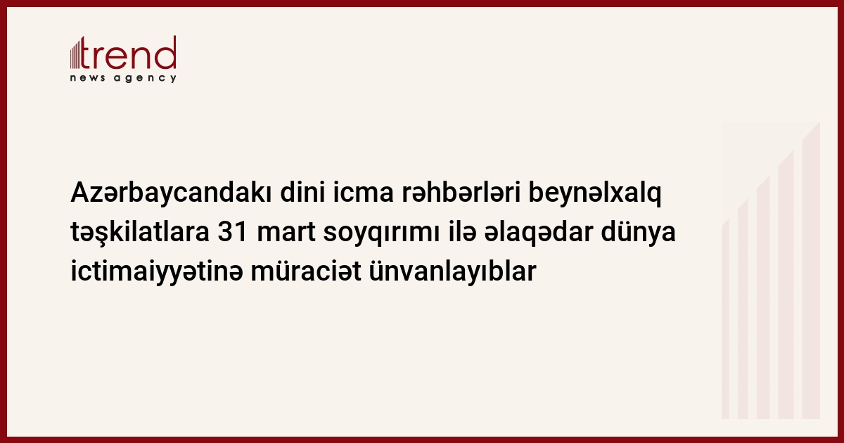 Qafqaz Müsəlmanları İdarəsinin (QMİ) sədri Şeyxülislam Allahşükür Paşazadə, Bakı və Azərbaycan Arxiyepiskopu Aleksandr, Azərbaycandakı Dağ yəhudiləri icmasının rəhbəri Melih Yevdayev dünya dini liderlərinə, parlamentlərə, beynəlxalq təşkilatlara 31 mart - Azərbaycanlıların Soyqırımı Günü ilə bağlı müraciət ünvanlayıblar.