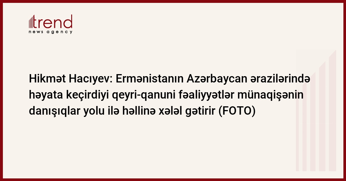 Azərbaycan Respublikası Prezidenti Administrasiyasının xarici siyasət məsələləri şöbəsinin müdiri Hikmət Hacıyev açılış nitqində Azərbaycan ərazilərinin Ermənistan tərəfindən işğalı nəticəsində bu ərazilərdə qeyri-qanuni iqtisadi fəaliyyətlərin həyata keçirildiyi, resurslardan qeyri-qanuni istifadə edildiyi və məcburi köçkünlərin mülkiyyət hüquqlarının pozulduğunu qeyd edib. Bu xüsusda, bir sıra praktiki nümunələrə diqqəti çəkərək İsveçrənin tanınmış şirkəti “Frank Müller”, eləcə də “Airbnb” şirkətinin qanunsuz fəaliyyətlərindən bəhs edib. O qeyd edib ki, Ermənistanın Azərbaycan ərazilərində həyata keçirdiyi qeyri-qanuni fəaliyyətlər münaqişənin danışıqlar yolu ilə həllinə xələl gətirir və münaqişənin uzanmasına xidmət edir. O, eyni zamanda Azərbaycanın münaqişə ərazilərində qeyri-qanuni fəaliyyətlər mövzusunun inkişafına və aktuallaşmasına fəal surətdə töhfə verdiyini vurğulayıb.