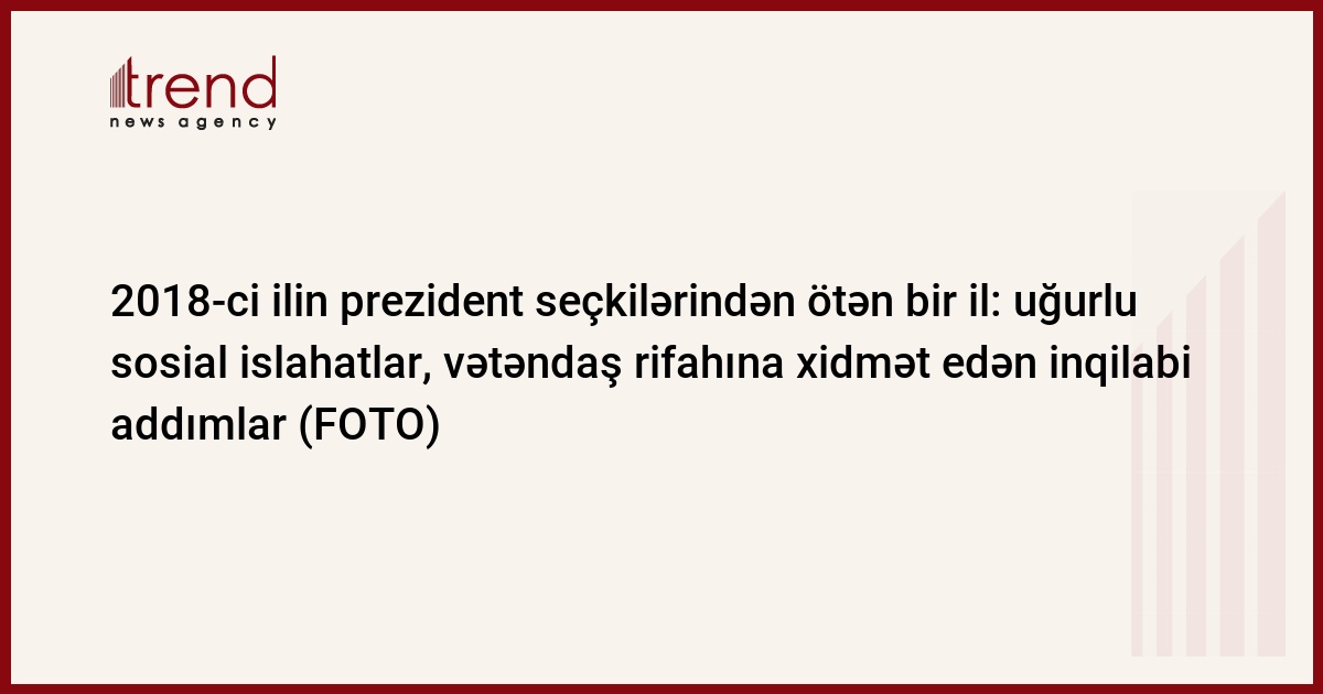 Ölkəmizdə 11 aprel 2018-ci il tarixdə keçirilən prezident seçkilərindən artıq bir il ötür. Azərbaycan Respublikasının Prezidenti cənab İlham Əliyevin seçkilərdə növbəti dəfə xalqın böyük əksəriyyətinin səsini qazanaraq parlaq qələbəyə nail olması ölkə əhalisinin rifah halının yaxşılaşdırılmasına xidmət edən inqilabi addımların atılması ilə xarakterik yeni uğurlu islahatlar mərhələsinə keçidə təminat vermiş oldu.