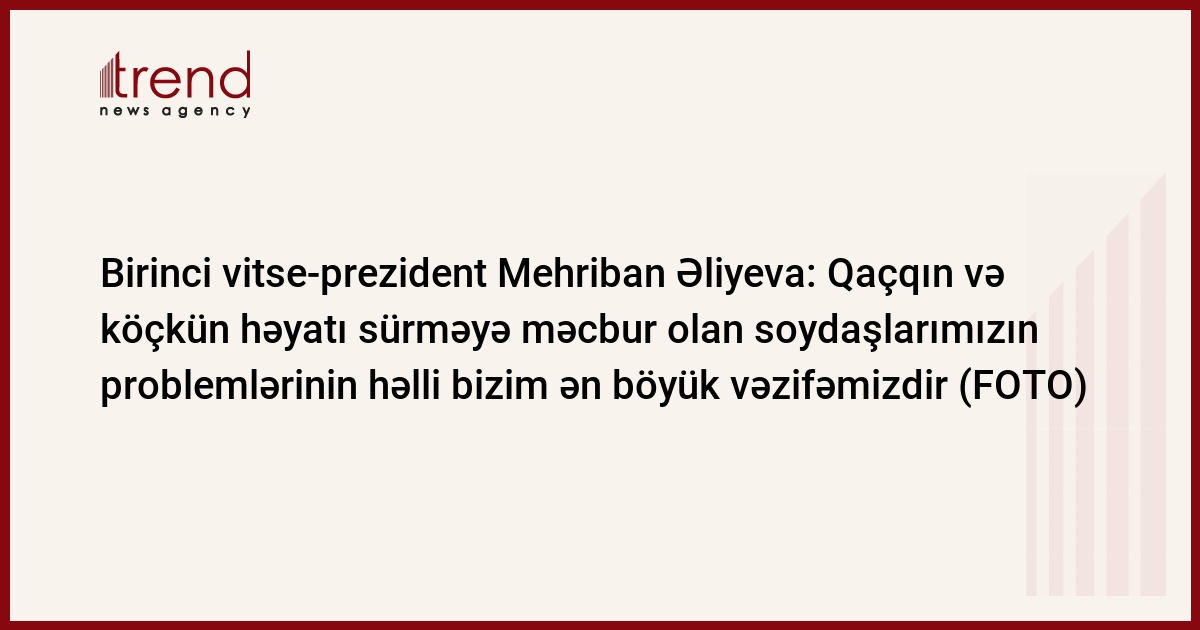 Mehriban Əliyeva: Qarabağ problemi ölkəmizin ən böyük problemidir və daim Prezidentin diqqət mərkəzindədir. Bu münaqişə və torpaqlarımızın işğal altına düşməsi nəticəsində qaçqın və köçkün həyatı sürməyə məcbur olan soydaşlarımızın problemlərinin həlli bizim ən böyük vəzifəmizdir.
