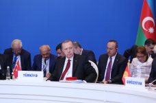Mən, ilk növbədə, Azərbaycan Prezidenti cənab İlham Əliyevə qonaqpərvərliyə və bu görüşün yüksək səviyyədə təşkil edilməsinə görə təşəkkürümü bildirmək istəyirəm. Çox şadam ki, Özbəkistan Prezidenti cənab Şavkat Mirziyoyev təşkilatımızın tamhüquqlu üzvü kimi bizə qoşulub. Mən, həmçinin Qazaxıstanın birinci Prezidenti cənab Nazarbayevi bizim Şuranın fəxri sədri kimi bu Zirvə Görüşündə iştirakı münasibətilə təbrik edirəm. Bu Şura onun təşəbbüsü və ideyası əsasında yaradılıb. Cənab Nazarbayev, Siz bu Şuranın yaradılmasına böyük töhfə vermisiniz. Düşünürəm ki, cənab Nazarbayevə bizim Şuranın ömürlük fəxri sədri adının verilməsi çox düzgün qərar olub.