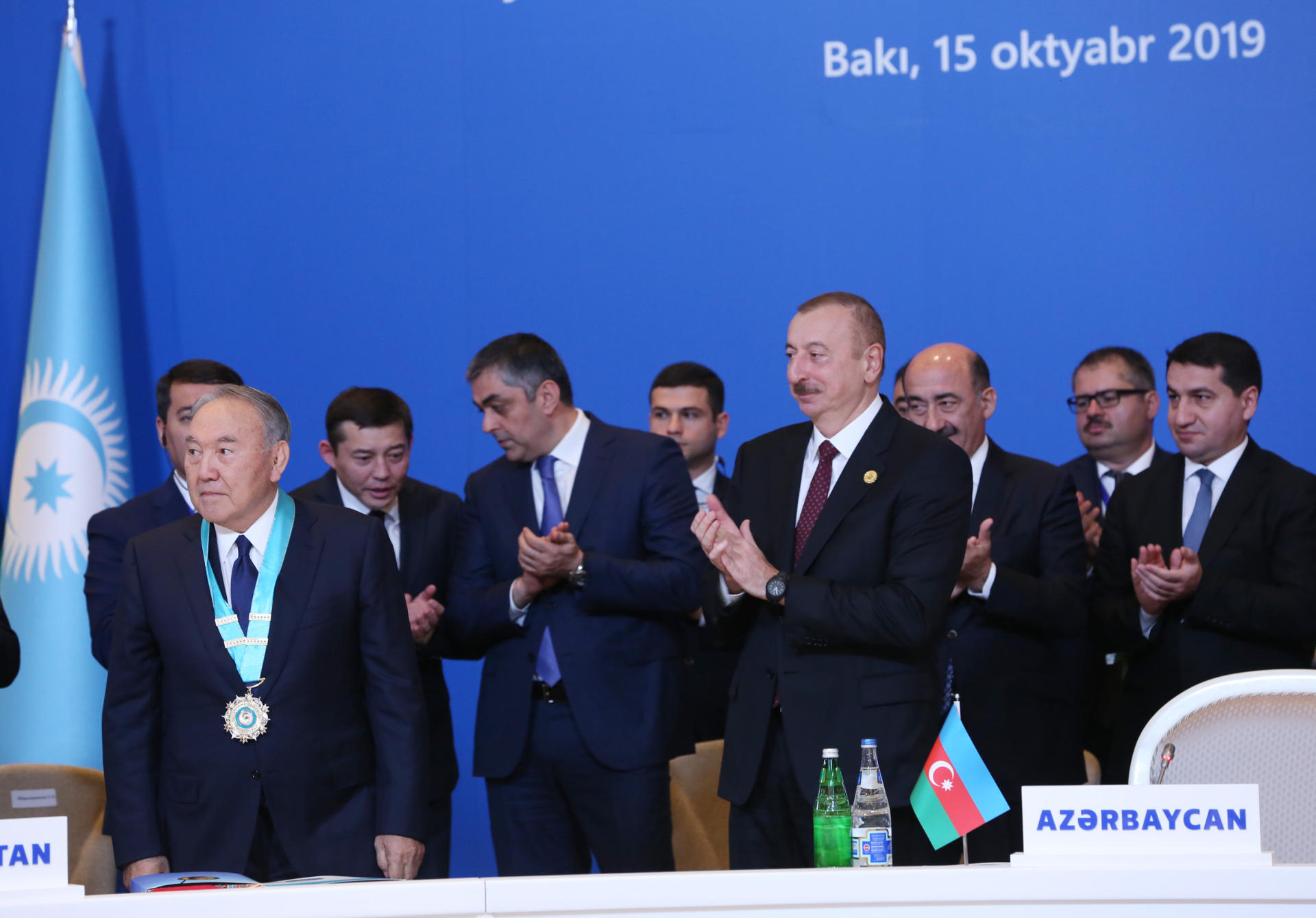 Bu Zirvə Görüşünü tarixi edən digər bir məqam isə türk dünyasının ağsaqqalı, Qazaxıstan Respublikasının qurucu Prezidenti əziz qardaşım elbası Nazarbayevə minnətdarlığımızın bir göstəricisi olaraq təklifim əsasında Türk Şurasının fəxri prezidenti adının təqdim edilməsidir. Hörmətli ağsaqqalım, Zati-alinizə təqdirlərimi və təbriklərimi ifadə edirəm.