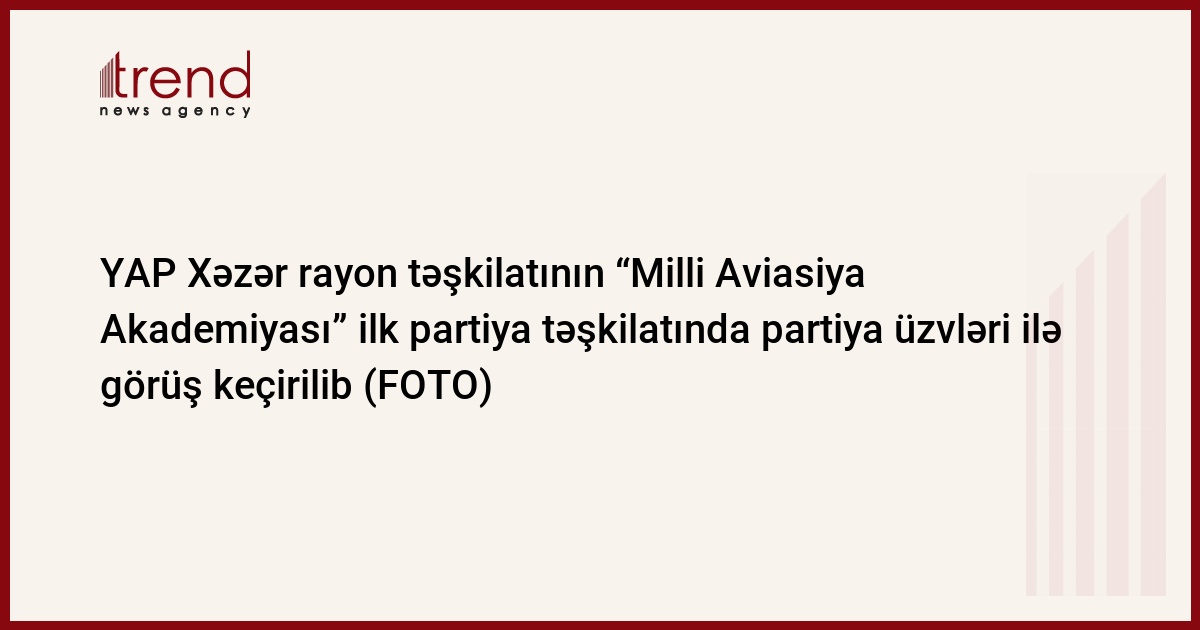 Trend-in məlumatına görə, görüşdə “Milli Aviasiya Akademiyası” ilk partiya təşkilatının sədri Ənvər Həzərxanov, YAP Xəzər rayon təşkilatının sədri Namiq Əhmədov, millət vəkili Rauf Əliyev və partiya üzvləri iştirak ediblər.