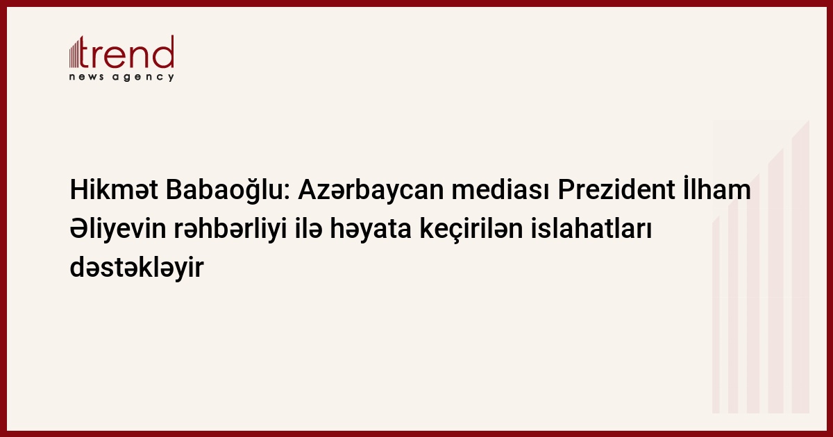 Tam qətiyyətlə deyə bilərik ki, Azərbaycan mediası ictimai institut kimi, Prezident İlham Əliyevin rəhbərliyi ilə həyata keçirilən və Azərbaycanın uğurlu inkişafını təmin edən islahatları dəstəkləyir. Təsadüfi deyil ki, Prezident İlham Əliyev də Azərbaycan mediasının fəaliyyətinə həmişə yüksək qiymət verib və mediamızın sərbəst fəaliyyəti üçün münbit şərait yaradılıb. Dövlət başçısı dəfələrlə vurğulayıb ki, o, özü də ölkəmizdə baş verən bir çox məsələlərdən məhz Azərbaycan mətbuatı vasitəsilə xəbər tutur və dərhal reaksiya verərək lazımi addımları atır. Prezident İlham Əliyevin "Jurnalistlər bəlkə də özləri də bilmədən mənim köməkçilərimdir" fikri Azərbaycan mətbuatının fəaliyyətinə göstərilən etimadın, jurnalistlərin əməyinə verilən yüksək qiymətin ifadəsidir. Dövlət başçısı mütəmadi olaraq ictimai fəallığın, vətəndaş təşəbbüskarlığının əhəmiyyətini qeyd edərək bu zaman yenə də media orqanlarının roluna diqqət çəkir".