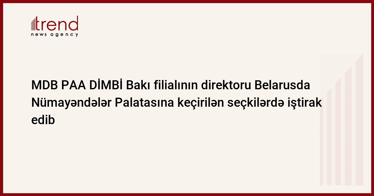 MDB PAA DİMBİ Bakı filialından Trend-ə verilən məlumata görə, filialın direktoru E.B. İmaməliyev MDB PAA-dan olan beynəlxalq müşahidəçi qrupunun tərkibində qısamüddətli müşahidəni həyata keçirmək üçün Minsk şəhərinə ezam olunub və seçkilərinin təşkili və keçirilməsini müşahidə etmək üçün bir sıra seçki məntəqələrində olub.