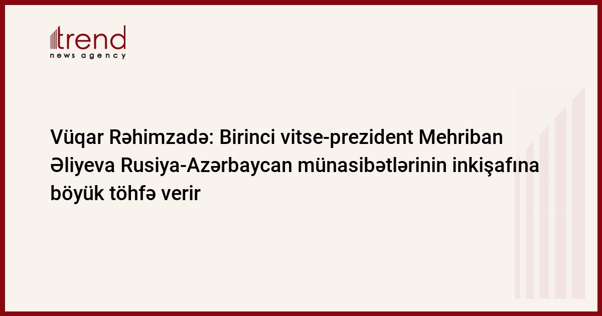 Vüqar Rəhimzadə bildirib ki, Azərbaycanın Birinci vitse-prezidenti Mehriban Əliyevanın Rusiyaya səfəri çərçivəsində bu ölkənin Rusiya Federal Məclisi Federasiya Şurasının sədri Valentina Matviyenko, Rusiya Federasiyası Hökumətinin sədri Dmitri Medvedev, Rusiya Federasiyasının Prezidenti Vladimir Putinlə görüşməsi, “Dostluq” ordeni ilə təltif olunması, Moskvanın Xalq Təsərrüfatı Nailiyyətləri Sərgisindəki “Azərbaycan” pavilyonunun əsaslı bərpa və təmirdən sonra açılışında, X Azərbaycan-Rusiya Regionlararası Forumunda iştirak etməsi əlamətdar hadisə oldu.
