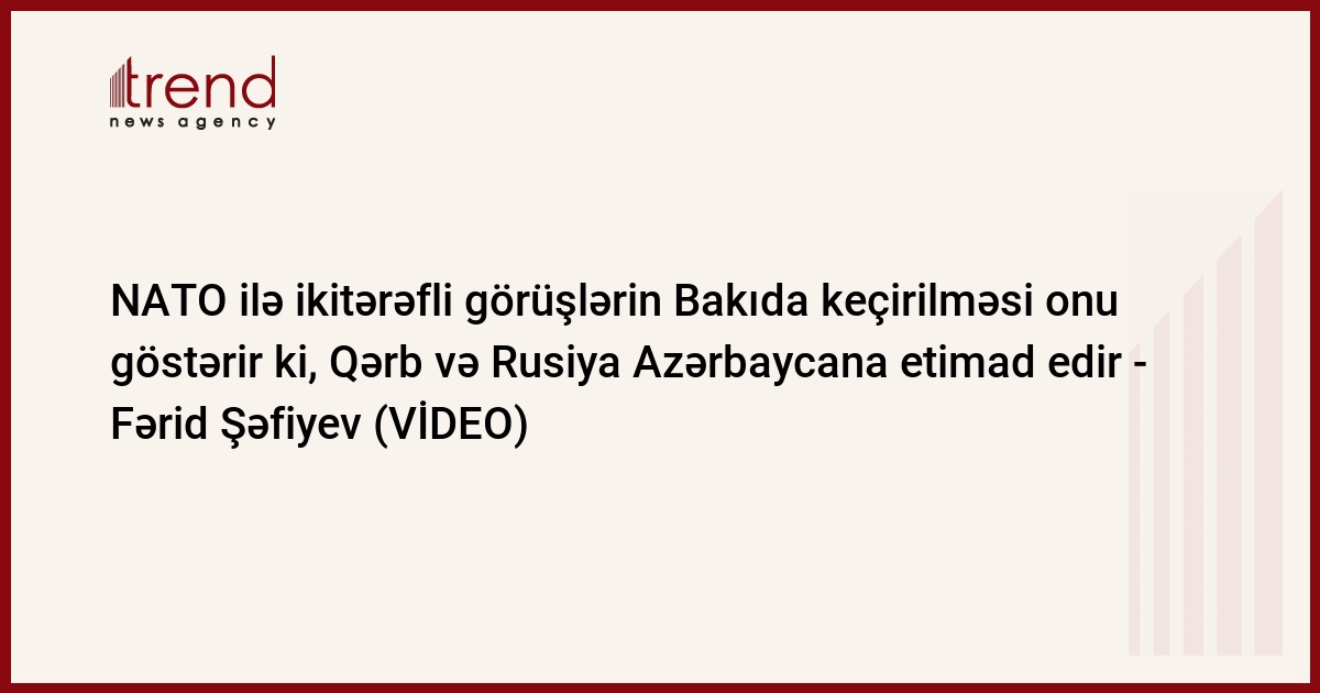 Beynəlxalq Münasibətlərin Təhlili Mərkəzinin (BMTM) sədri Fərid Şəfiyev "PREZİDENT. Müstəqillik. Təhlükəsizlik. Rifah" adlı videolayihə çərçivəsində Trend-ə bildirib ki, Qərb və Rusiya Azərbaycana etimad edir. Artıq Azərbaycan Rusiya üçün müəyyən bir platformaya çevrilib: “Söhbət Rusiya Federasiyası Silahlı Qüvvələrinin Baş Qərargah rəisi Valeri Gerasimovun Bakıda NATO-nun Hərbi Komitəsinin sədri Ser Stüart Piiç ilə görüşündən gedir. Artıq NATO ilə təmaslar, ikitərəfli görüşlər Bakıda keçirilir. Bu da onu göstərir ki, Qərb və Rusiya Azərbaycana etimad edir”.