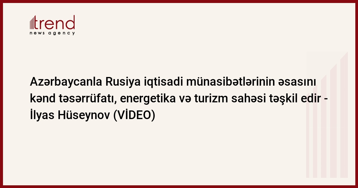 Bunu "PREZİDENT. Müstəqillik. Təhlükəsizlik. Rifah" adlı video layihə çərçivəsində Trend-ə Sosial Tədqiqatlar Mərkəzinin baş məsləhətçisi İlyas Hüseynov deyib. Onun sözlərinə görə, Azərbaycanla Rusiya iqtisadi münasibətlərin əhəmiyyətli hissəsini kənd təsərrüfatı, energetika və turizm sahəsində olan münasibətlər təşkil edir: