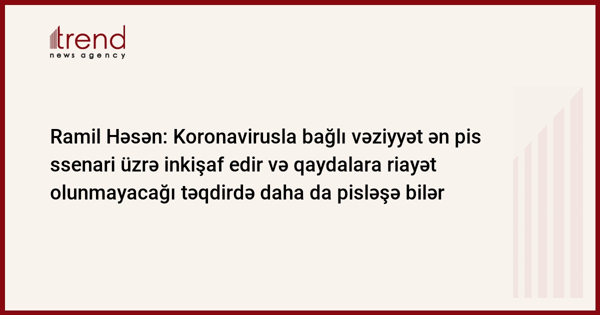 Bu gün bəşəriyyət koronavirus pandemiyasının təhdidi altındadır. Koronavirusla bağlı vəziyyət ən pis ssenari üzrə inkişaf edir və məsuliyyətsiz davranılacağı, qaydalara riayət olunmayacağı təqdirdə daha da pisləşə bilər.