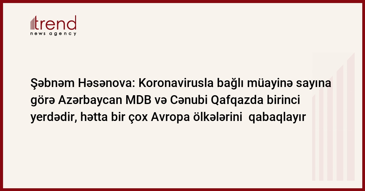 Ümumdünya Səhiyyə Təşkilatının məlumatına əsasən, koronavirus (COVİD-19) pandemiyası ilə mübarizədə mühüm amillərdən biri müayinələrin düzgün aparılması və xəstəlik hallarının zamanında aşkarlanmasıdır. Koronavirusla bağlı müayinə sayına görə Azərbaycan MDB və Cənubi Qafqazda birinci yerdədir, hətta bir çox Avropa ölkələrini qabaqlayır.