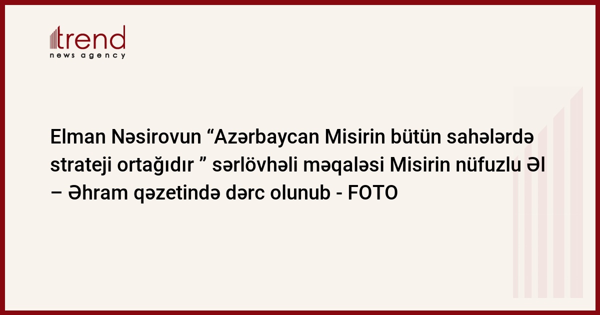 Millət vəkili Elman Nəsirovun Misirin nüfuzlu Əl – Əhram qəzetində “Azərbaycan Misirin bütün sahələrdə strateji ortağıdır” adlı müsahibəsi dərc olunub.