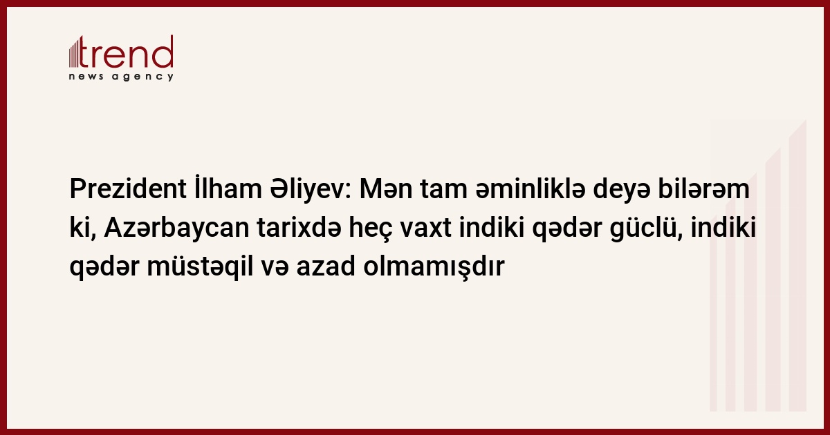 Mən tam əminliklə deyə bilərəm ki, Azərbaycan tarixdə heç vaxt indiki qədər güclü, indiki qədər müstəqil və azad olmamışdır.