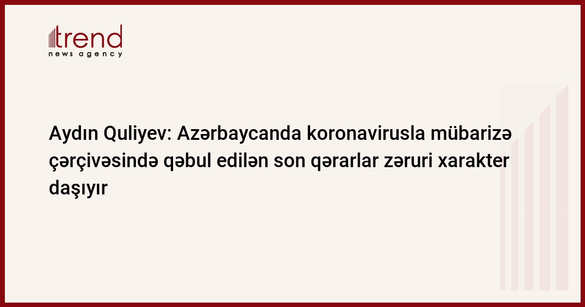Azərbaycanda koronavirusla mübarizə çərçivəsində qəbul edilən son qərarlar bütün dünyada pandemiyanın yayılma templərinin artmasına və ölkəmizdə sırf vətəndaş məsuliyyətsizliyi üzündən yeni dalğa təhlükəsinin özünü real olaraq göstərməsinə tam adekvat və zəruri xarakter daşıyır.