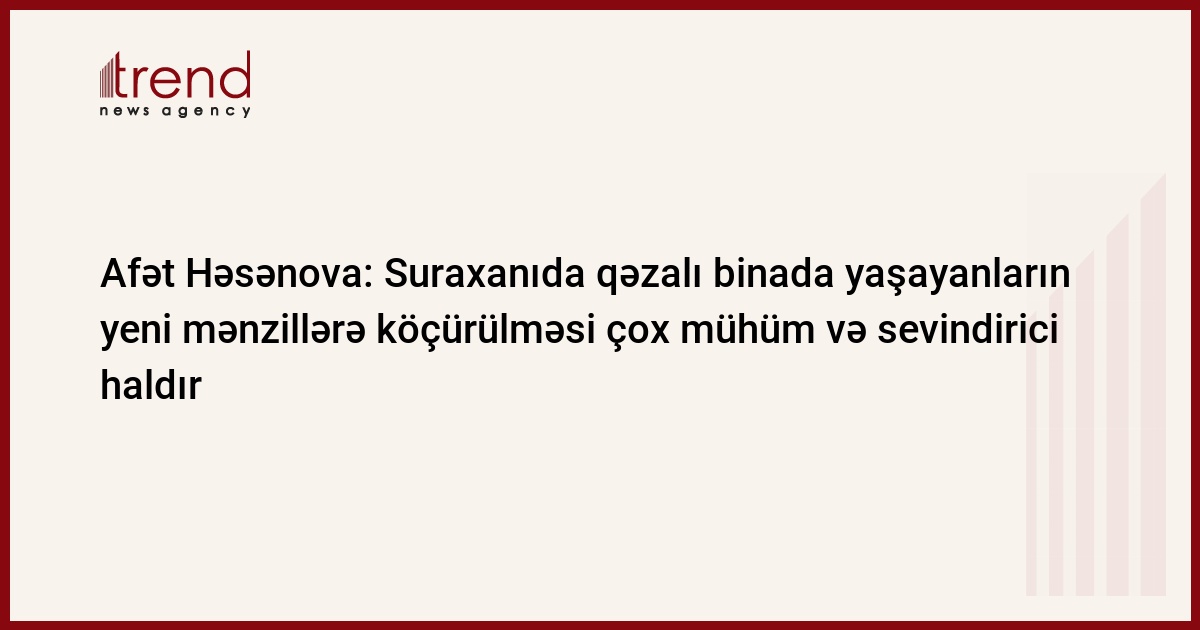 Epidemioloji vəziyyətlə əlaqədar yaşadığımız bu çətin günlərdə Suraxanı rayonu, Yeni Suraxanı qəsəbəsi, Xanlar Ələkbərov küçəsi 72 ünvanda yerləşən qəzalı yaşayış binasının təhlükəli şəraitdə yaşayan sakinləri yeni mənzillərə köçürülüb. Bunu Trend-ə Milli Məclisin deputatı Afət Həsənova deyib.