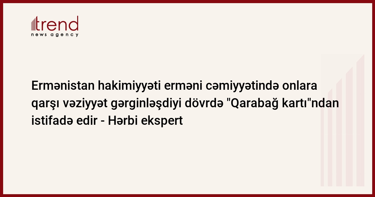 Ermənistanda hakimiyyətdə olan bütün siyasi qüvvələr erməni cəmiyyətində onlara qarşı vəziyyət gərginləşdiyi dövrdə "Qarabağ kartı"ndan istifadə edirlər. Bunu Trend-ə açıqlamasında hərbi siyasi icmalçı Ramil Məmmədli deyib.