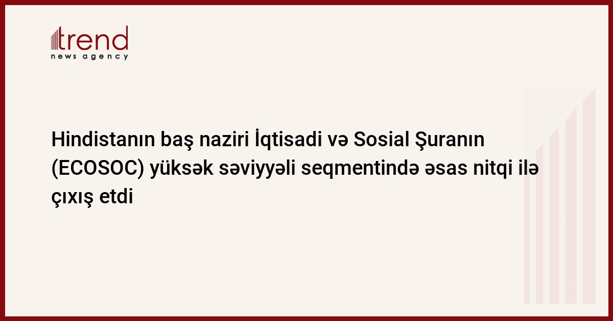 Baş nazir Şri Narendra Modi, 17 iyul, 2020-ci il tarixində cümə günü Nyu Yorkda yerləşən Birləşmiş Millətlər Təşkilatında keçirilən bu ilin yüksək səviyyəli seqmenti olan Birləşmiş Millətlər Təşkilatının İqtisadi və Sosial Şurasının sessiyasında (ECOSOC) əsas nitqi ilə virtual şəkildə çıxış etdi.