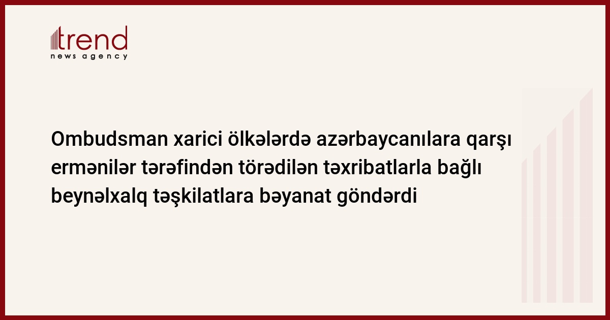 Azərbaycan Respublikasının İnsan Hüquqları üzrə Müvəkkili Səbinə Əliyeva (Ombudsman) xarici ölkələrdə yaşayan dinc azərbaycanlı aksiyaçılara qarşı erməni təxribatçıları tərəfindən törədilmiş hücumlara dair bəyanat yayıb.
