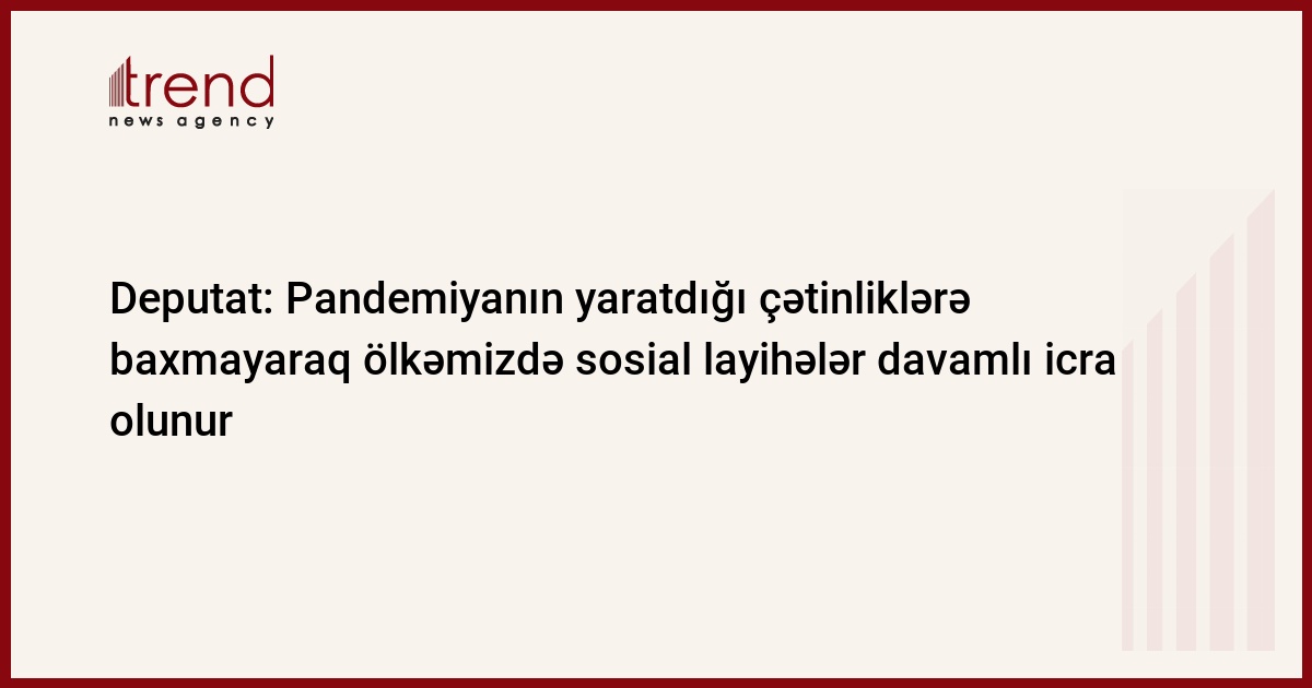 Dünyada koronavirus pandemiyası bütün ölkələri iqtisadi-sosial baxımdan çətin durumda qoyub. Bir çox ölkələr pandemiya səbəbindən sosialyönlü layihələri təxirə salmaq məcburiyyətində qalıblar. Bunu Trend-ə Milli Məclisin deputatı Afət Həsənova deyib.