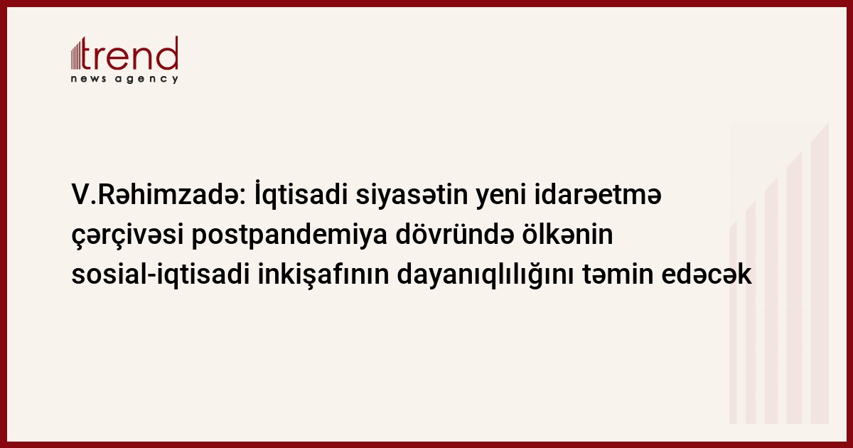 V.Rəhimzadə dövlətimizin başçısı İlham Əliyevin məlum Fərmanında əksini tapan bu məqama da xüsusi diqqət yönəldib ki, son illərdə dünya iqtisadiyyatında potensial iqtisadi artım templərinin aşağı düşməsi, qlobal maliyyə sabitliyinin kövrəkliyinin artması, xüsusilə ilin əvvəllərindən başlanan koronavirus pandemiyası və onunla əlaqədar əksər ölkələrdə sosial-iqtisadi fəallığın məhdudlaşması Azərbaycan iqtisadiyyatı qarşısında da yeni strateji siyasət çağırışları yaratmışdır. Əldə edilmiş sosial-iqtisadi göstəricilərin qlobal mühitdə dayanıqlı saxlanılması və daha da yüksəldilməsi üçün milli iqtisadiyyatımızın beynəlxalq rəqabət qabiliyyəti gücləndirilməli, ölkədə makroiqtisadi və maliyyə sabitliyi qorunmalıdır. Milli iqtisadi inkişaf qarşısında duran strateji çağırışlara adekvat cavab vermək, yeni iqtisadi artım və inkişaf modelinə uğurlu keçidi təmin etmək, bunun üçün iqtisadi siyasət və iqtisadi islahatlar çərçivəsini formalaşdırmaq məqsədilə ölkədə iqtisadi siyasətin yeni strateji idarəetmə çərçivəsinin yaradılması tələb olunur.