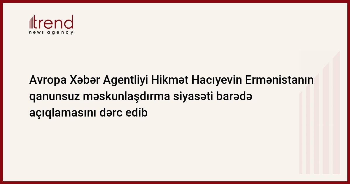 Avropa Xəbər Agentliyinin İtaliya üzrə xüsusi müxbiri, “Eurasiaticanews” portalının rəhbəri Karlo Marino sözügedən agentlikdə Azərbaycan Respublikası Prezidentinin köməkçisi - Prezident Administrasiyasının Xarici siyasət məsələləri şöbəsinin müdiri Hikmət Hacıyevin Ermənistan tərəfindən Azərbaycanın işğal olunmuş ərazilərində aparılan qeyri-qanuni məskunlaşma siyasəti ilə bağlı açıqlamasını dərc edib (https://www.european-news-agency.de/politik/statement_by_hikmat_hajiyev_azeri_foreign_affairs_-79186/).