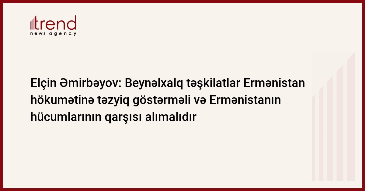 E.Əmirbəyov deyib ki, Ermənistan ötən gecə Gəncəni bombalayıb: “Bu, Ermənistanın münaqişənin sülh yolu ilə həllini istəmədiyini göstərdi. Hesab edirəm ki, beynəlxalq təşkilatlar bu məsələdə Ermənistan hökumətinə təzyiq göstərməli və Ermənistanın hücumlarının qarşısı alınmalıdır”.