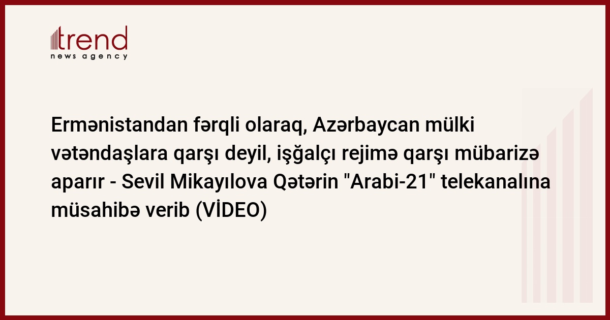 Milli Məclisin deputatı Sevil Mikayılova Ermənistanın Azərbaycana qarşı təxribatları və atəşkəs sonrası vəziyyətlə bağlı Qətərin “Arabi21” televiziya kanalına müsahibə verib.