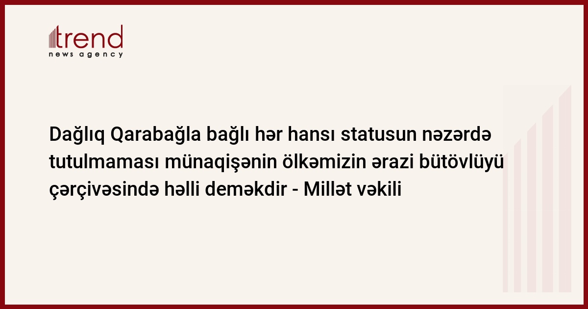 Bu gün Ermənistan - Azərbaycan Dağlıq Qarabağ münaqişəsinə son qoyulur. Tarixi gündür. Razılaşmada nəzərdə tutulan şərtlər barədə geniş məlumat verildiyindən qeyd etmək istərdim ki, bu bəyanatda Dağlıq Qarabağ ilə bağlı hər hansı statusun nəzərdə tutulmaması münaqişənin ölkəmizin ərazi bütövlüyü çərçivəsində həlli deməkdir. Bu fikirləri millət vəkili Vüqar Bayramov deyib.