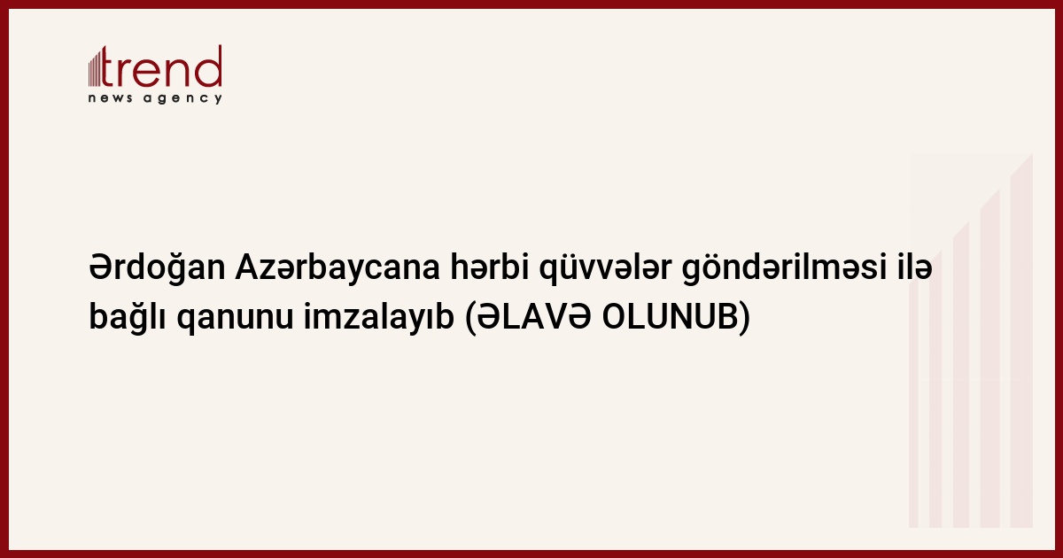 Türkiyə Prezidenti Rəcəb Tayyib Ərdoğan Türkiyə Böyük Millət Məclisinin Azərbaycana hərbi qüvvələr göndərilməsi ilə bağlı qəbul etdiyi qanunu imzalayıb.