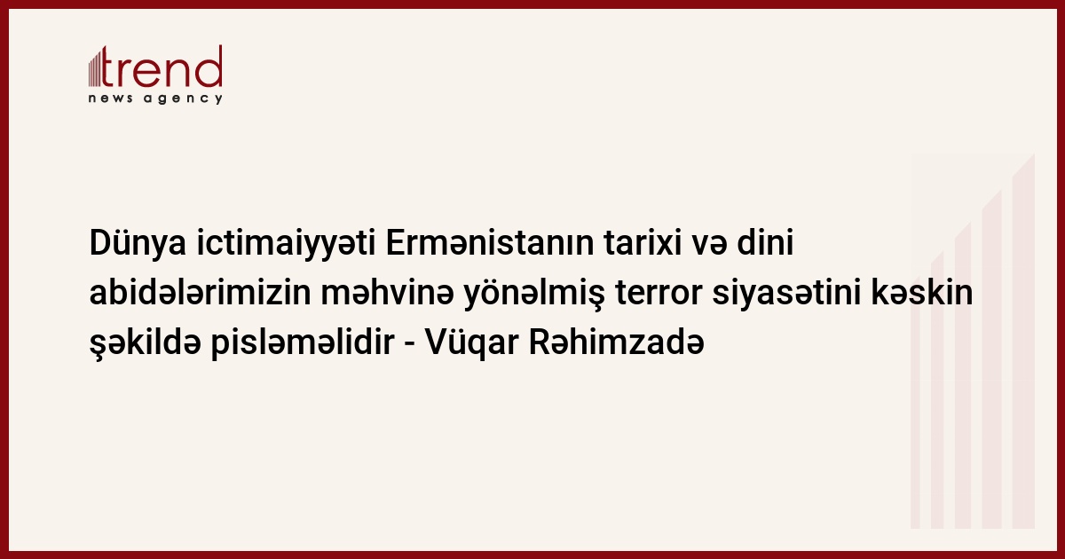 Vüqar Rəhimzadə qeyd edib ki, dini və tarixi abidələrə münasibətdə ermənilərin həyata keçirdikləri vandalizm aktlarının qarşısı beynəlxalq hüququn norma və prinsiplərinə uyğun olaraq qəti şəkildə alınmalıdır: “Bir müddət öncə işğaldan azad olunmuş Qubadlı rayonunun Məmər kəndində yerləşən məscidin yerlə-yeksan edilməsi, eləcə də tarixin saxtalaşdırılması cəhdləri Ermənistanın işğalçılıq siyasətinin əyani sübutları kimi diqqət çəkməkdədir. Məhz işğal olunmuş ərazilərdə çoxəsrlik tarixi olan maddi-mənəvi irsin dağıdılması beynəlxalq hüququn və konvensiyaların, xüsusilə də 1954-cü ildə “Silahlı münaqişələr zamanı mədəni dəyərlərin qorunması haqqında” Haaqa Konvensiyasının və 1999-cu ildə ona əlavə edilmiş Protokolların tələblərinin kobud şəkildə pozulmasıdır. Bu mənada dünyanın aparıcı dövlətlərinin, beynəlxalq təşkilatların rəhbərləri, dini liderlər, bütövlükdə dünya ictimaiyyəti diqqəti bu cür barbarlıq və vandalizm əməllərinə yönəltməli, Ermənistanın mədəni və mənəvi terror siyasətini ifşa etməlidirlər”.