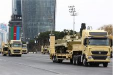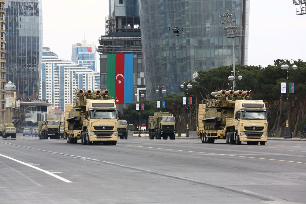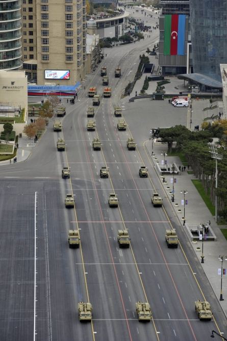 Azadlıq meydanında keçid edən, üzərində 12,7 millimetrlik NSV pulemyotları, tank əleyhinə idarə olunan “SPIKE-ER”, “NLOS”, “LAHAT” raketləri, 120 millimetrlik “SPEAR” minaatanlar quraşdırılan “SandCat-Stormer” zirehli idarəetmə, çevik hərəkət maşınları, piyada daşıyan zirehli maşınlar, “Kobra” və “BTR-82A” zirehli transportyorları, PDM-2 və PDM-3 texnikaları, “T-72”, “T-90S” tankları Azərbaycan Ordusunun hərbi qüdrətini nümayiş etdirdi.