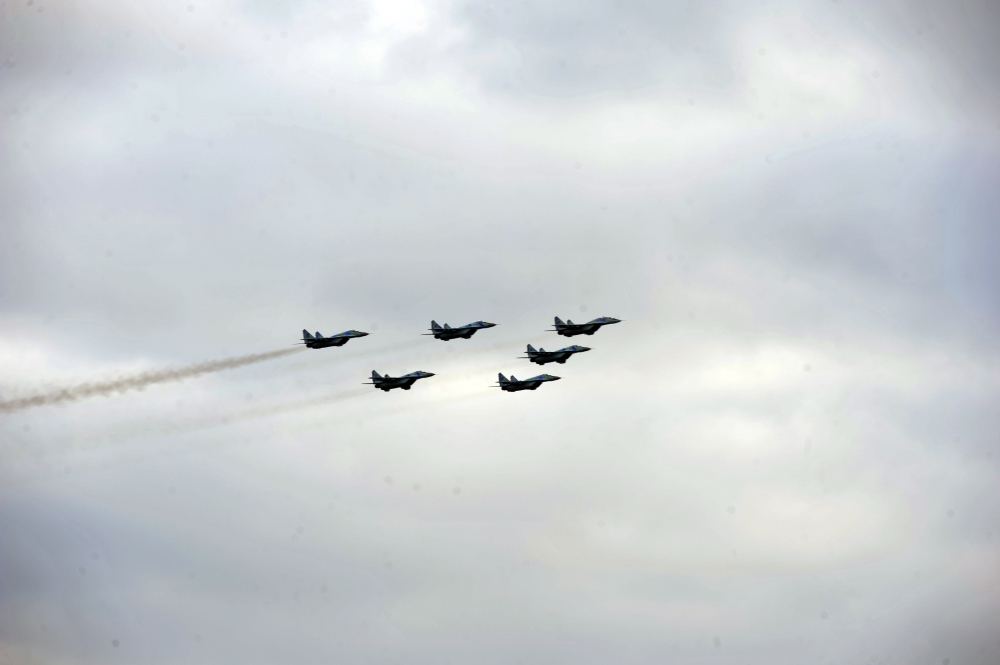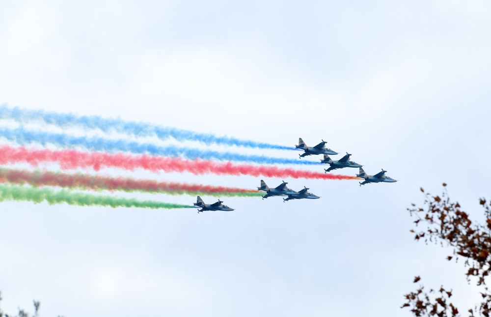 Bundan sonra Azadlıq meydanı üzərində Azərbaycan Hərbi Hava Qüvvələrinə məxsus döyüş təyyarələrinin və helikopterlərin uçuşu başladı. “Qarabağ” ordenli polkovnik Həsən Əlövsətovun rəhbərlik etdiyi “Mİ-17” hərbi nəqliyyat-desant helikopterləri cütlüyü Azərbaycan və Türkiyə respublikalarının dövlət bayraqları ilə Bakı buxtasının üzərindən uçaraq Zəfər paradının iştirakçılarını salamladı. Bunun ardınca Vətən Müharibəsi Qəhrəmanı polkovnik-leytenant Rəşad Nadirovun başçılığı ilə “Mİ-35” hücum helikopterləri qrupunun uçuşu oldu. Polkovnik-leytenant Rəhim Quluzadənin başçılığı ilə “LAHAT” və “SPAYK” uzunmənzilli raketləri ilə silahlanmış “Mİ-17” helikopterlərinin və “Qarabağ” ordenli polkovnik Zaur Rüstəmovun rəhbərliyi ilə “MİQ-29” çoxməqsədli qırıcı təyyarələr qruplarının uçuşları da maraqla qarşılandı. Zəfər paradında döyüş təyyarə və helikopterlərinin çıxışını müasir silahlarla təchiz olunmuş “Su-25” hücum və hava dəstək təyyarələr qrupu tamamladı. Vətən Müharibəsi Qəhrəmanı general-mayor Namiq İslamzadənin başçılıq etdiyi qrupun səmada Azərbaycan Respublikasının dövlət bayrağının təsvirini yaratması üçrəngli şanlı bayrağımızın daim yüksəklərdə dalğalanacağını təcəssüm etdirdi.