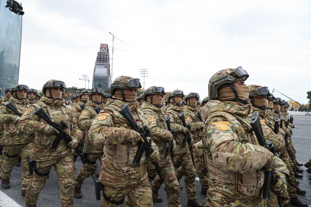 Daha sonra polkovnik Səid İsayevin başçılığı ilə Əlahiddə Ümumqoşun Ordunun xüsusi təyinatlıları, polkovnik Taleh Məşədiyevin rəhbərliyi ilə Birinci Ordu Korpusunun döyüşçüləri, polkovnik Nemət Müseyibovun başçılığı ilə İkinci Ordu Korpusunun, polkovnik-leytenant Kamran Ağabalayevin rəhbərliyi ilə Üçüncü Ordu Korpusunun, polkovnik İlham Məmmədovun başçılığı ilə Dördüncü Ordu Korpusunun və polkovnik-leytenant Dəyanət Müslümovun rəhbərliyi ilə Altıncı Ordu Korpusunun hərbi qulluqçuları tribuna önündən keçdilər.