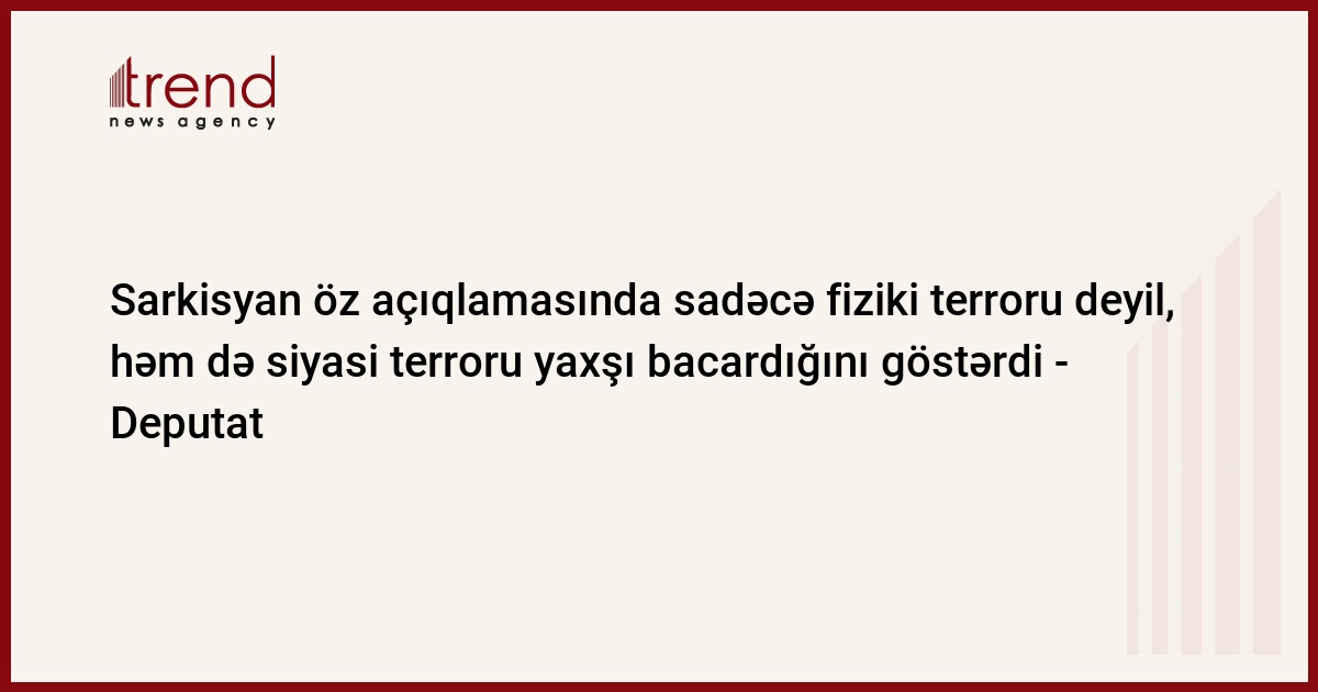Deputat vurğulayıb ki, Sarkisyan öz açıqlamasında sadəcə fiziki terroru deyil, həm də siyasi terroru yaxşı bacardığını göstərir: "Onun bu terroru isə daha çox öz xalqına yönəlmiş siayasi terordur. Erməni ictimai rəyini terrorizə edərək bildirir ki, guya 2016-cı il Aprel döyüşlərində Azərbaycan məğlub ediləcəyini başa düşərək atəşkəs haqqında qərar qəbul edib. Ancaq elə növbəti cümləsindəcə özünü təkzib edərək bildirir ki, o, atəşkəs üçün Rusiyaya müraciət edib. Bax, bu, əsl siyasi terror nümunəsidir. Ona görə də Sarkisyanın bu müsahibədə səsləndirdiyi fkirlər kifayətdir ki, o, terrorçu kimi mühakimə edilsin və dünyada antiterror koalisiyasından danışanlar ilk növbədə Ermənistanın da adını terror təşkilatı kimi siyahıya daxil etsinlər".