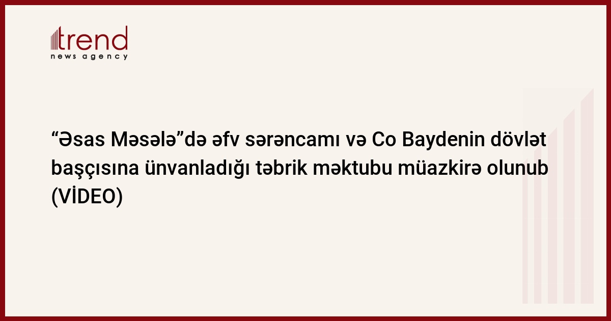 Prezident İlham Əliyev ötən gün növbəti humanist addım olaraq, "Məhkum edilmiş bir sıra şəxslərin əfv olunması haqqında" Sərəncam imzaladı. ABŞ Prezidenti Co Baydenin Novruz bayramı münasibətilə dövlət başçısı İlham Əliyevə ünvanladığı təbrik məktubunda isə Birləşmiş Ştatların Azərbaycanla əməkdaşlığı bundan sonrakı dövrdə də davam etdirməyə sadiqliyi ifadə olunur. Hər iki mühüm hadisə bu gün AzTV-nin “Əsas Məsələ ” verilişinin əsas müzakirə mövzusu olub. Bundan başqa proqramda Prezident İlham Əliyevin işğaldan azad olunan torpaqlarımıza səfərlərinin Ermənistanda niyə siyasiləşdirilməsi məsələsinə də toxunulub.