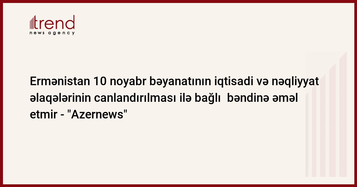 "Azernews" qəzetində 20 Aprel tarixində işıq üzü görmüş məqalədə Ermənistanın 10 noyabr bəyanatının iqtisadi və nəqliyyat əlaqələrinin canlandırılması ilə bağlı 9-cu bəndinə əməl etməməsi və bu bəndin həyata keçirilməsi prosesini ləngitməsindən bəhs edilir.