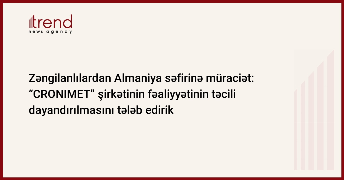 Zəngilan rayonundan olan məcburi köçkünlər Almaniyanın “CRONIMET” şirkəti ilə bağlı tədbir görülməsi üçün bu ölkənin Azərbaycandakı səfiri Volfqanq Maniqə müraciət ediblər.