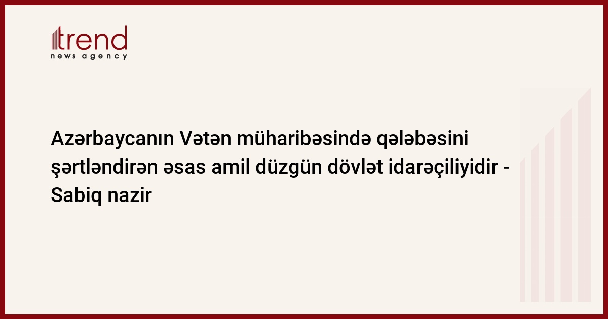 Azərbaycanın 44 günlük Vətən müharibəsində qələbəsini şərtləndirən əsas amil düzgün dövlət idarəçiliyi idi. Düzgün dövlət idarəçiliyinin əsasında həm uğurlu daxili və xarici siyasət formalaşır, həm müdafiə sisteminin formalaşması və yüksək səviyyəyə çıxması təmin olunur, həm də insanların vətənpər ruhda yetişdirilməsi həyata keçirilir.
