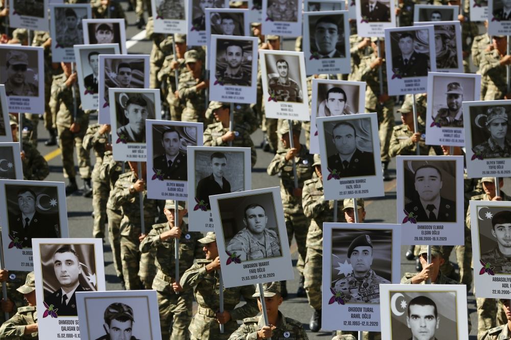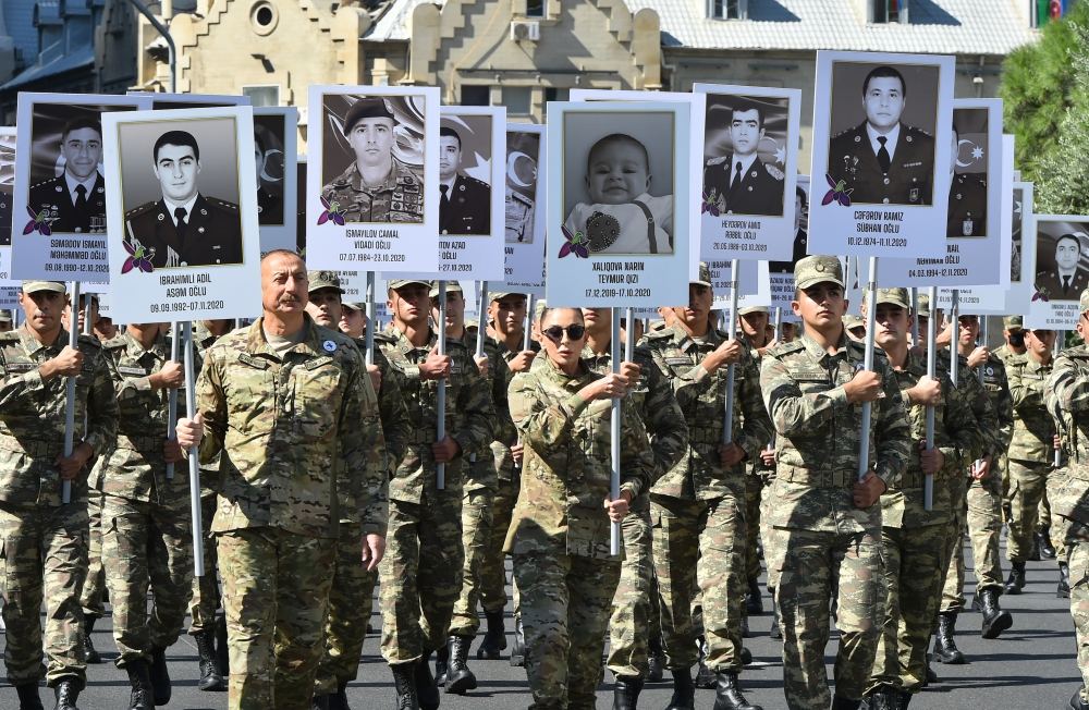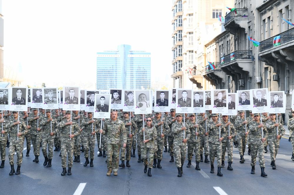 Trend xəbər verir ki, Azərbaycan Respublikasının Prezidenti, Müzəffər Ali Baş Komandan İlham Əliyev, birinci xanım Mehriban Əliyeva, gənc kursantlar və hərbçilər Vətən müharibəsi zamanı Azərbaycanın ərazi bütövlüyü uğrunda şəhid olan igidlərimiz, itkin düşən hərbçilərimiz və Ermənistan dövləti tərəfindən törədilən insanlıq əleyhinə və müharibə cinayətləri nəticəsində qətlə yetirilən mülki əhalimizin hər birinin fotolarından ibarət plakatlarla yürüş edərək xalqın birliyinin daimi və sarsılmaz olduğunu, Vətənə sevgi, şəhidlərimizə ehtiramın əbədiliyini bir daha nümayiş etdiriblər.