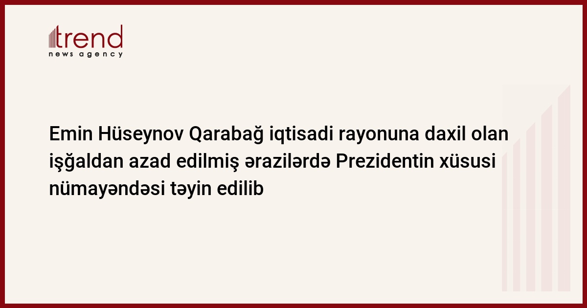 Trend-in məlumatına görə, Emin Zamin oğlu Hüseynov “Azərbaycan Respublikasında iqtisadi rayonların yeni bölgüsü haqqında” Azərbaycan Respublikası Prezidentinin 2021-ci il 7 iyul tarixli 1386 nömrəli Fərmanı ilə müəyyən edilmiş Qarabağ iqtisadi rayonuna daxil olan işğaldan azad edilmiş ərazilərdə (Şuşa rayonu istisna olmaqla) Azərbaycan Respublikası Prezidentinin xüsusi nümayəndəsi təyin edilib.