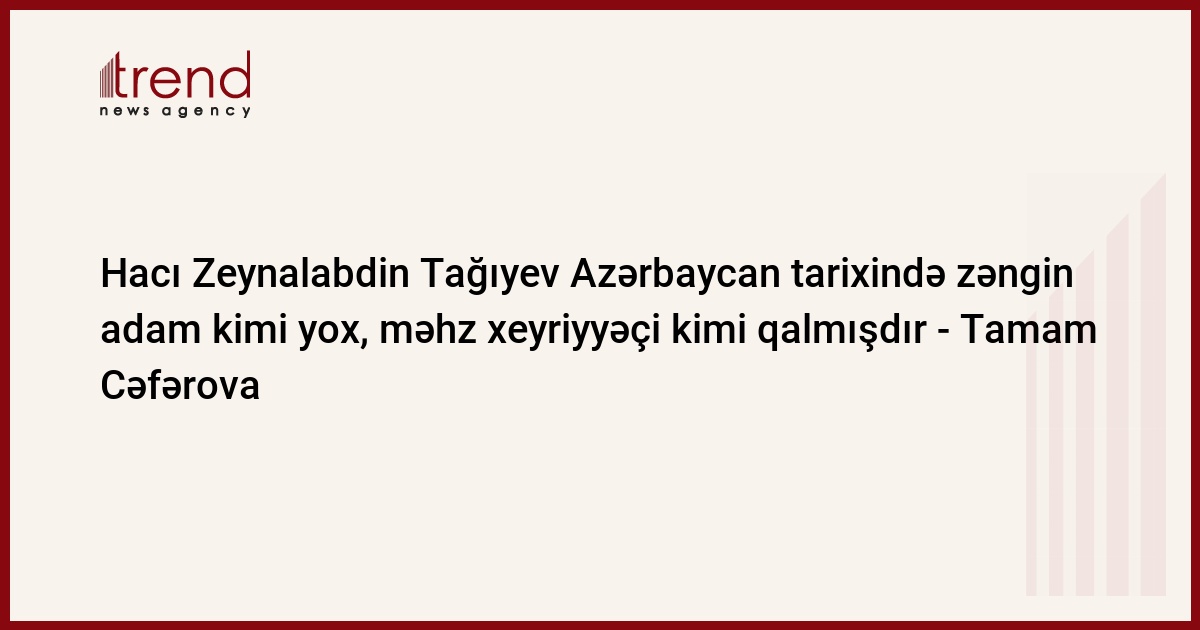 T.Cəfərova qeyd edib ki, Hacı Zeynalabdin Tağıyevin təşəbbüsü ilə Azərbaycanda bir çox önəmli layihələr həyata keçirilmişdir. Onların arasında Bakıya təmiz içməli suyun gətirilməsi layihəsi xüsusilə qeyd olunmalıdır. Şollar su kəməri bu günə qədər fəaliyyətdədir, bu günə qədər Bakını, Sumqayıtı təmiz içməli su ilə təmin edir. Bu kəmərin tikintisi üçün Zeynalabdin Tağıyev öz vəsaitindən istifadə etmişdir. Məhz onun təşəbbüsü və maliyyə dəstəyi ilə Bakıda teatr binası, bir çox sənaye müəssisəsi inşa edilmiş, Bakıda tramvay xətlərinin açılmışdır. Bu gün Bakıya əlavə gözəllik verən, Bakının memarlığına töhfə verən bir çox gözəl binaların təşəbbüskarı məhz Hacı Zeynalabdin Tağıyevdir. Z.Tağıyevin ən önəmli layihələrindən birinin də Azərbaycanlı qızlar üçün ilk dünyəvi məktəb açılmasının olduğunu qeyd edən Tamam Cəfərova bildirdi ki, Onun təhsillə bağlı təşəbbüsləri təkcə Bakı ilə məhdudlaşmırdı. Eyni zamanda, Naxçıvanda, Gəncədə, Şamaxıda, həmçinin Gürcüstanda azərbaycanlıların yaşadıqları bölgələrdə onun vəsaiti hesabına məktəblər açılmışdır.