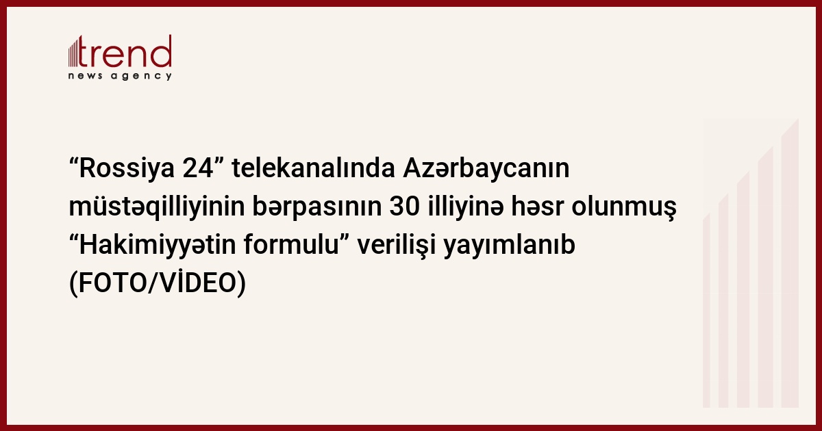 Yanvarın 30-da “Rossiya 24” telekanalında TASS informasiya agentliyinin baş direktorunun birinci müavini Mixail Qusmanın Azərbaycanın dövlət müstəqilliyinin bərpasının 30 illiyinə və Azərbaycan Prezidenti İlham Əliyevin 60 illik yubileyinə həsr olunmuş “Hakimiyyət formulu” verilişi yayımlanıb. Trend həmin verilişi təqdim edir.