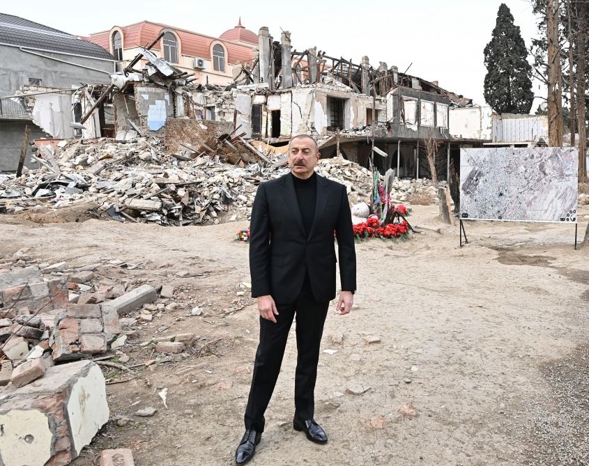 Bu gün, burada təməlini qoyduğum Memorial Kompleks böyük ərazini əhatə edəcək. Bu Memorial Kompleks təqribən dörd hektarda yaradılacaq. Dağıdılmış bu binalar olduğu kimi qalacaq. Yəni, bu yaddaş silinməməlidir. Bu erməni vəhşiliyini unutmamalıyıq. Müharibə başa çatıb. Bəli, biz deyirik ki, sülh olmalıdır. Ancaq heç vaxt erməni vəhşiliyini, erməni faşizmini unutmamalıyıq. Xocalı qurbanlarını unutmamalıyıq. Gəncə qurbanlarını, digər şəhərlərimizin qurbanlarını heç vaxt unutmamalıyıq və unutmayacağıq. Onların müqəddəs ruhu qarşısında baş əyərək bir daha deyirik ki, onların qanı yerdə qalmadı. Onların yaxınları üçün bəlkə də bu, təsəlli ola bilər. Eyni zamanda, deyirik ki, biz müzəffər xalqıq, biz qalib dövlətik. Erməni faşizmini məğlub etdik. Elə etməliyik ki, erməni faşizmi bundan sonra heç vaxt baş qaldırmasın".