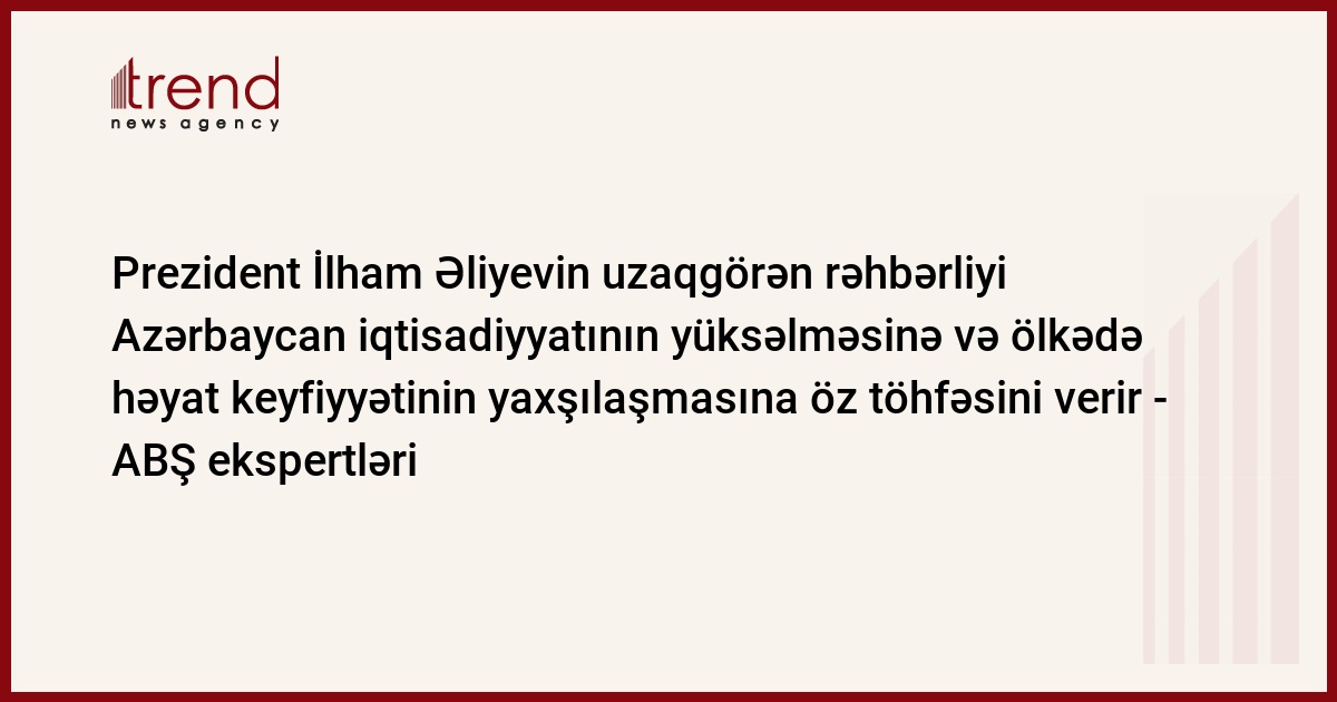 Bu faktı Trend-ə şərh edən amerikalı analitik İrina Tsukerman bildirib ki, Prezident İlham Əliyevin uzaqgörən rəhbərliyi ölkədə iqtisadiyyatın yüksəlməsinə və həyat keyfiyyətinin yaxşılaşmasına töhfə verir.