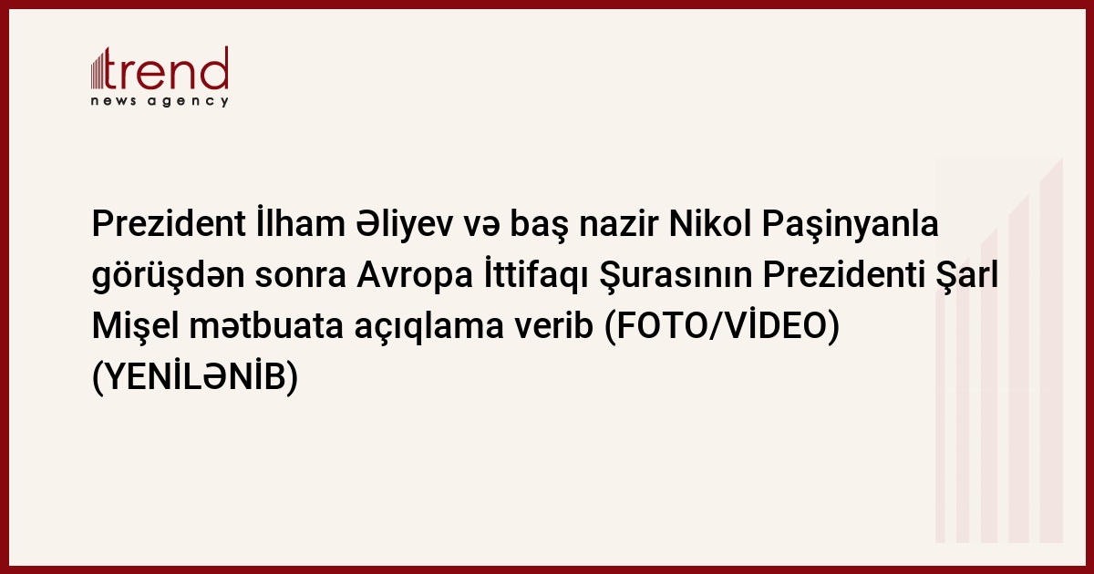 Avropa İttifaqı Şurasının Prezidenti Şarl Mişel Brüsseldə Azərbaycan Respublikasının Prezidenti İlham Əliyev və Ermənistan Respublikasının baş naziri Nikol Paşinyan ilə keçirilmiş görüşün yekunlarına dair mətbuata açıqlama verib.