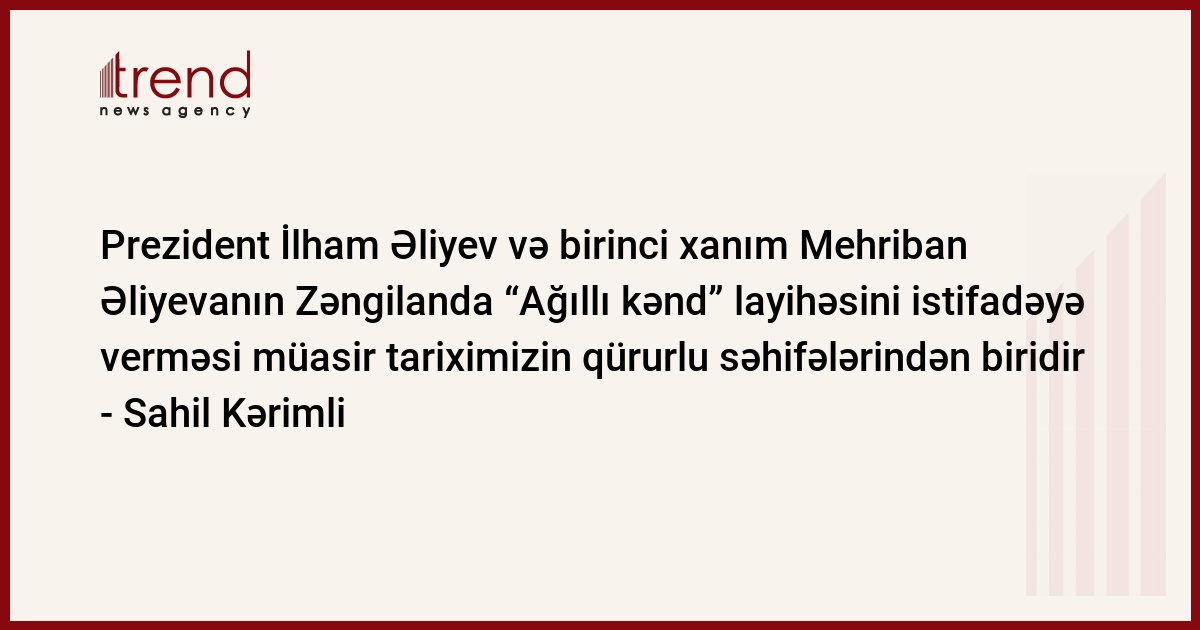 O, əlavə edib ki, Azərbaycan Prezidenti cənab İlham Əliyev və birinci xanım Mehriban Əliyevanın Zəngilanın Ağalı kəndində “Ağıllı kənd” layihəsini istifadəyə verməsi və kəndin ilk sakinləri ilə görüşü müasir tariximizin qürurlu səhifələrindən biridir: